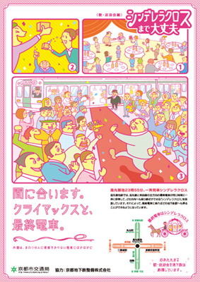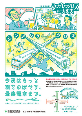 京都市営地下鉄が深夜12時近くまで運転していることをアピールするポスターです。年末の宴会シーズンと3月の歓送迎会シーズンに掲出。コママンガスタイルでわかりやすく市営地下鉄のメリットを訴求しました。