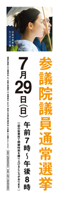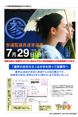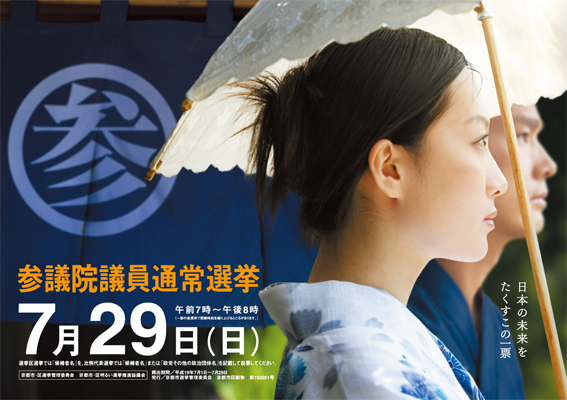 参議院選挙告知ポスターは全国の都道府県で同時に作成されることから、「京都市らしさを出したい」という意向を考慮し、マル参印の暖簾の前を歩く浴衣姿の男女で、京都らしさ?を表現しました。